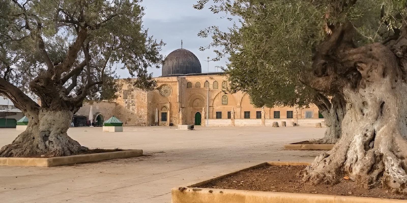 Image: A view of the Qibli Mosque framed by ancient olive trees in the Al-Aqsa compound
