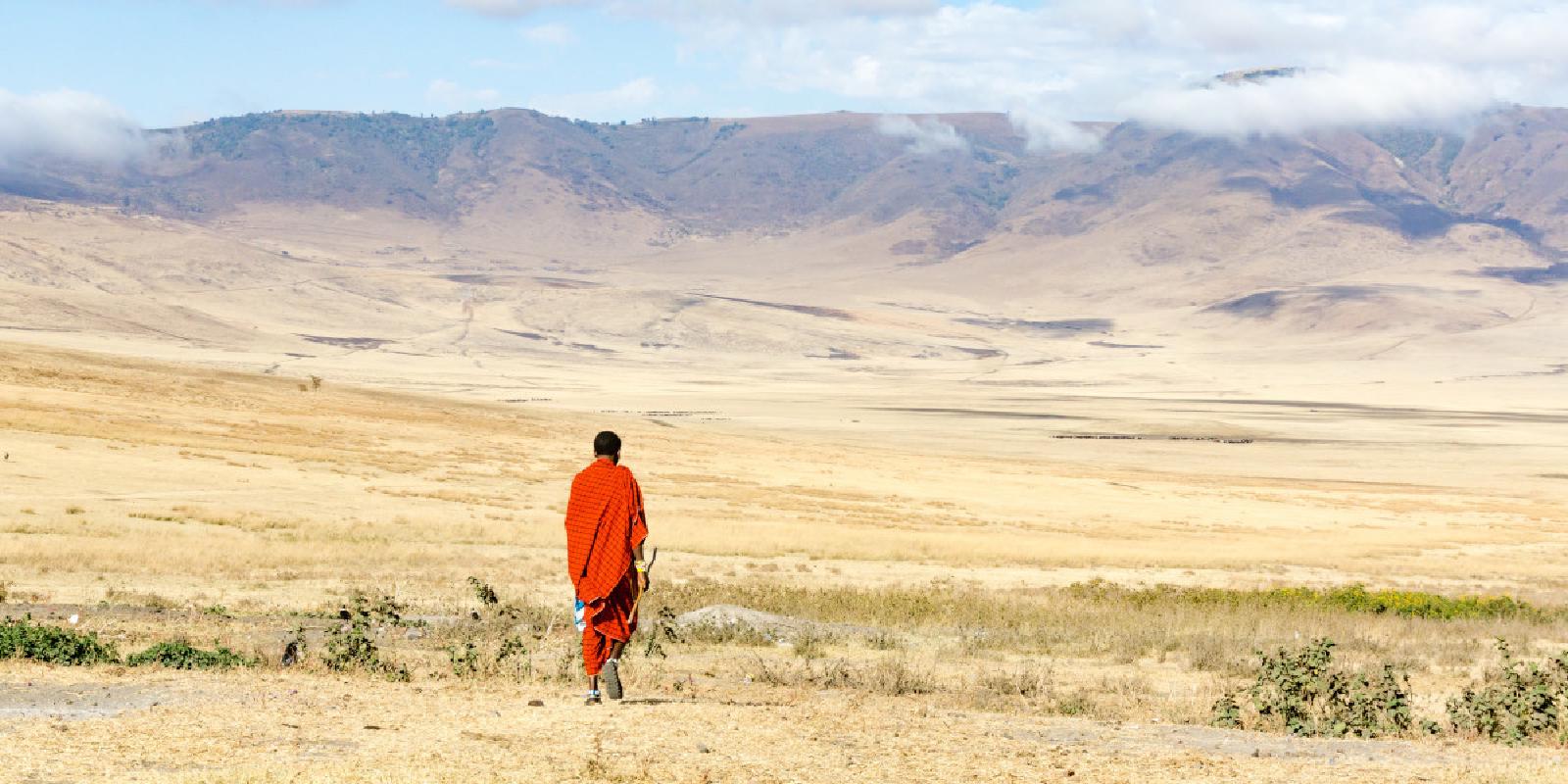 Image: A tribesman walks across the Tanzanian savannah at sunset